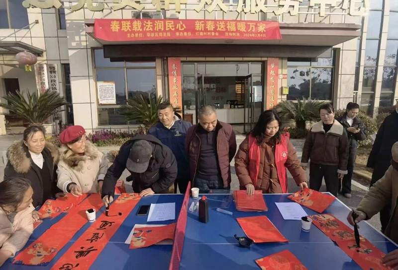 2月4日上午,华容区司法局联合灯塘村村委会,在灯塘村法治文化广场举办“法治春联进万家”活动。现场暖意融融、翰墨飘香。特邀的两位书法老师凝神提笔、挥毫泼墨,一行行饱含法治精神的春联在红纸上流淌:“法治精神凝伟业 公平理念润心田”“法润千家正义护 德馨万户和谐兴”“法典生辉昭正义 民心向党颂和谐”……一副副红底黑字的春联,喜庆庄重,既洋溢着新春纳福的吉祥寓意,又融入了法治内核,让严谨的法条化作温暖的祝福,让法治理念随着墨香渗入人心。