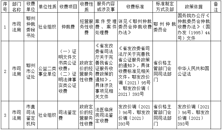 鄂州市司法局及下属单位综合性涉企收费目录清单