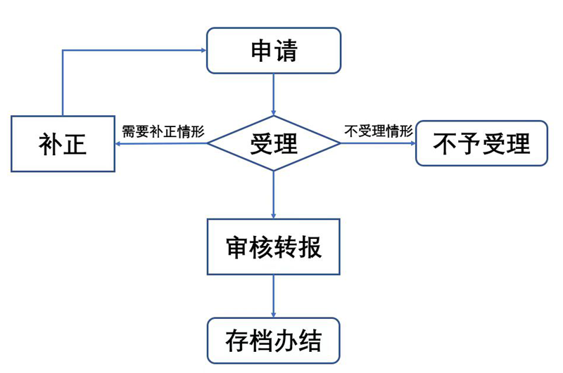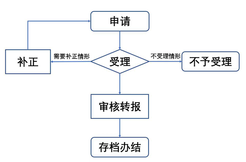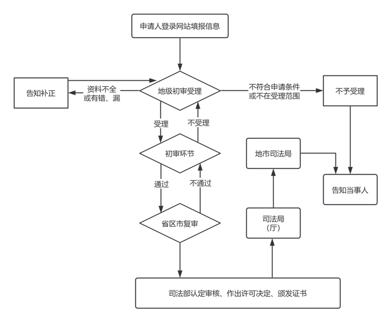 (一)受理:市司法局对收到的申请材料进行初步审核。经审核,对材料符合法定形式要求的予以受理,不符合要求退回补充材料。